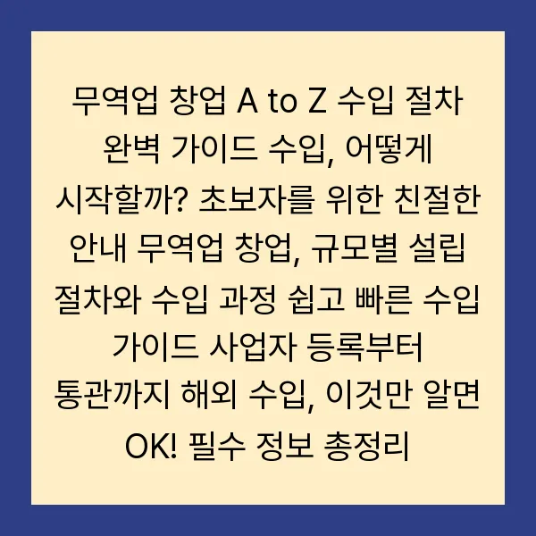 무역업 창업을 꿈꾸시나요? 특히 수입에 관심이 있지만 어디서부터 시작해야 할지 막막하신가요? 걱정 마세요! 이 글에서는 무역업 창업, 특히 수입 절차에 대한 모든 것을 A to Z로 담았습니다. 사업자 등록부터 통관, 시장 조사, 공급처 발굴, 마케팅 전략까지, 2025년 성공적인 수입 사업을 위한 완벽 가이드를 지금 바로 확인하세요! 소상공인, 소기업, 중기업 등 규모별 맞춤 전략과 숨겨진 꿀팁까지 아낌없이 공개합니다.